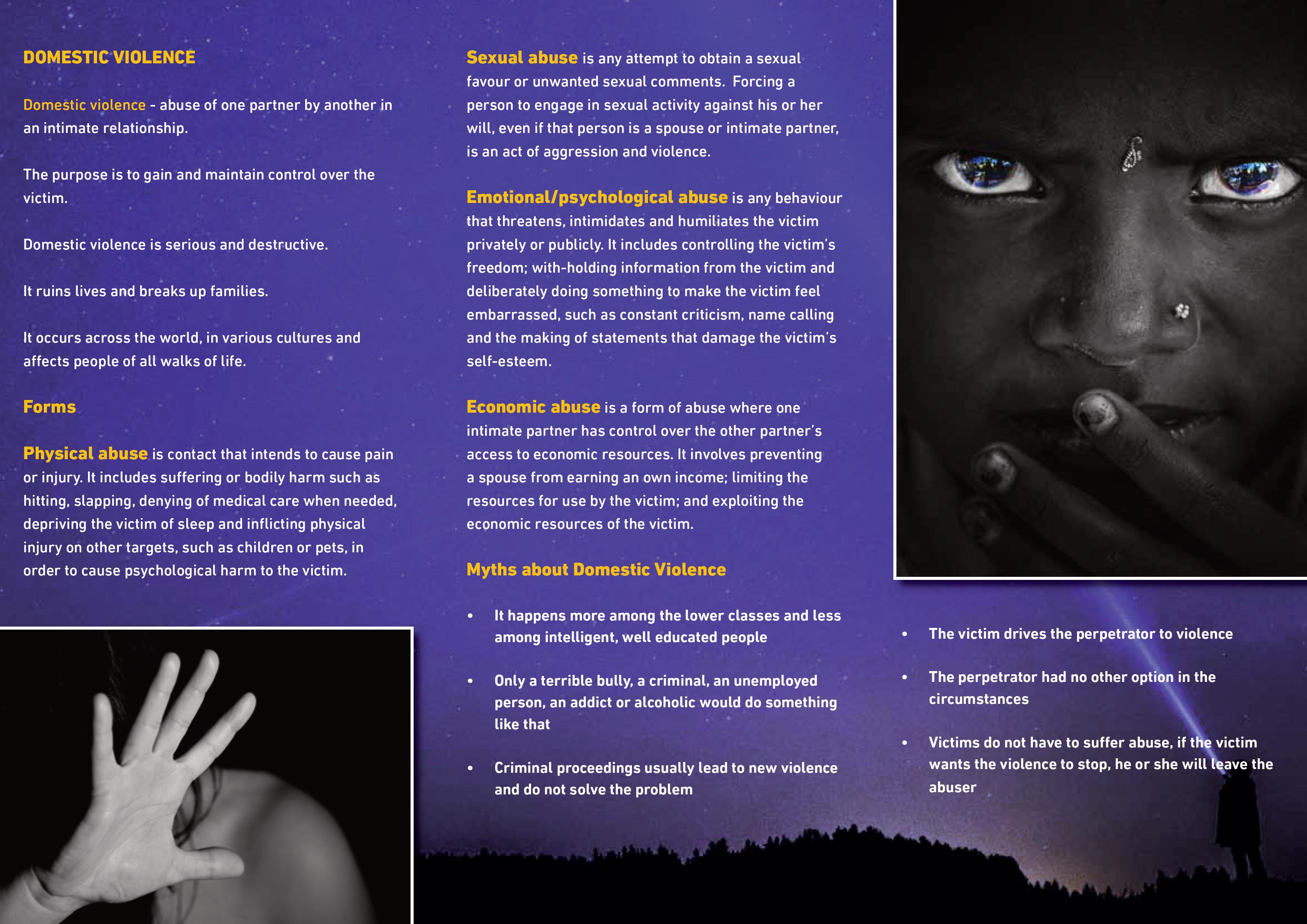 Get more information on what domestic violence is, the different forms of domestic violence and the myths about domestic violence.