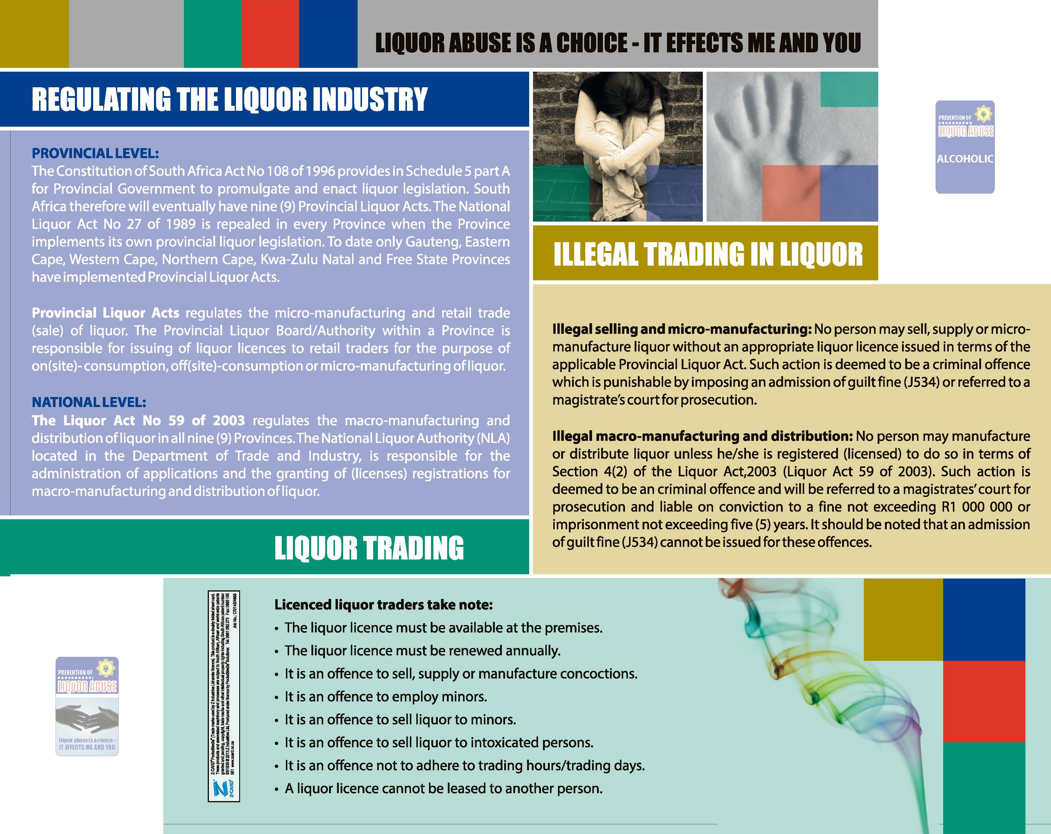 Liquor abuse is a choice – it affects me and you! Take responsibility and report liquor-related offences to the South African Police Service. Think before you drink, and discourage the abuse of alcohol. You can read more about the liquor trading industry regulations here.